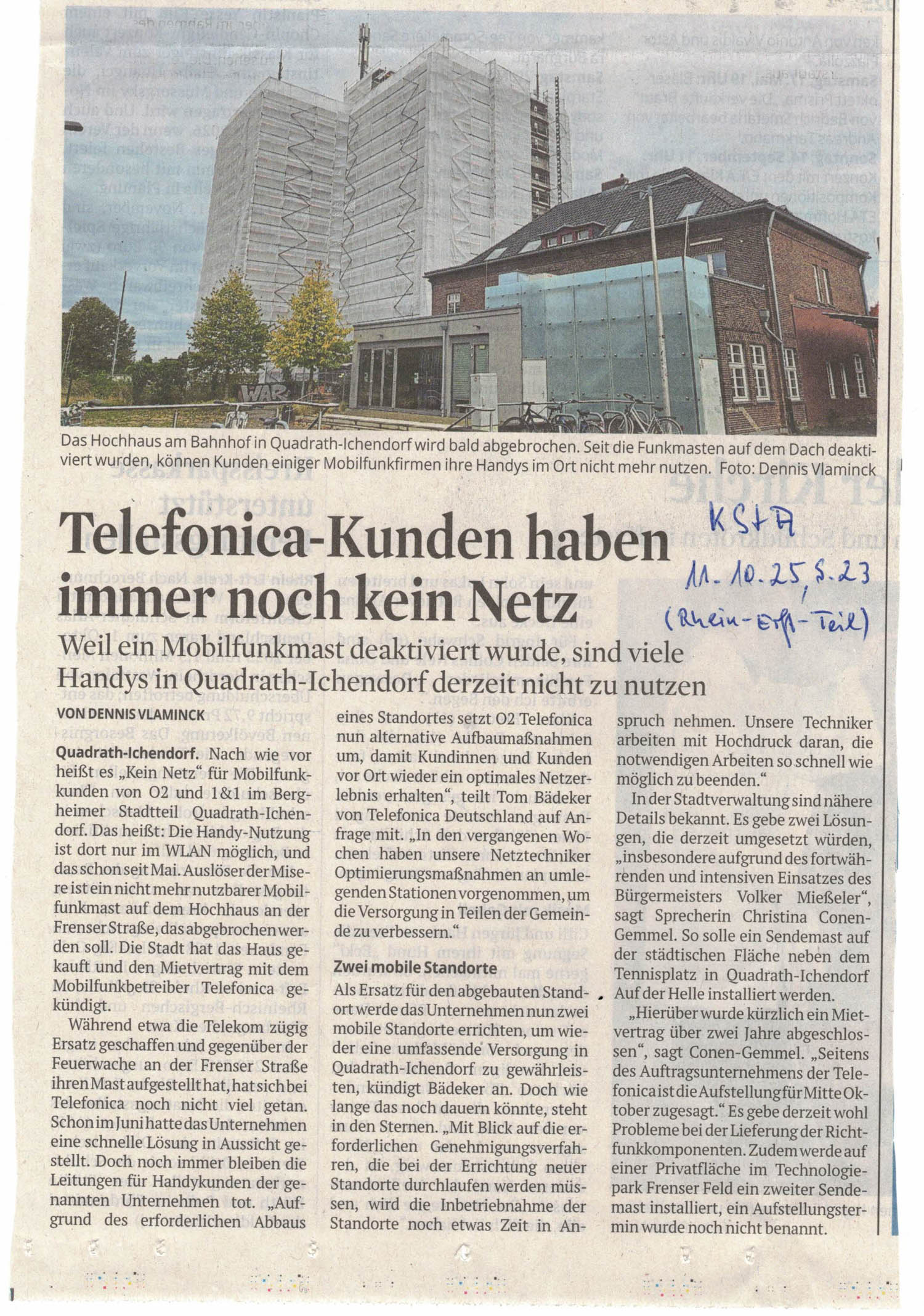 Auf eine anschließende nochmalige Beschwerde teilte Telefonica am 1.Oktober dann mit, dass man Mitte September eine Netzprüfung vorgenommen habe. Diese hätte ergeben, dass „alle gemeldeten Beeinträchtigungen behoben worden sind.“