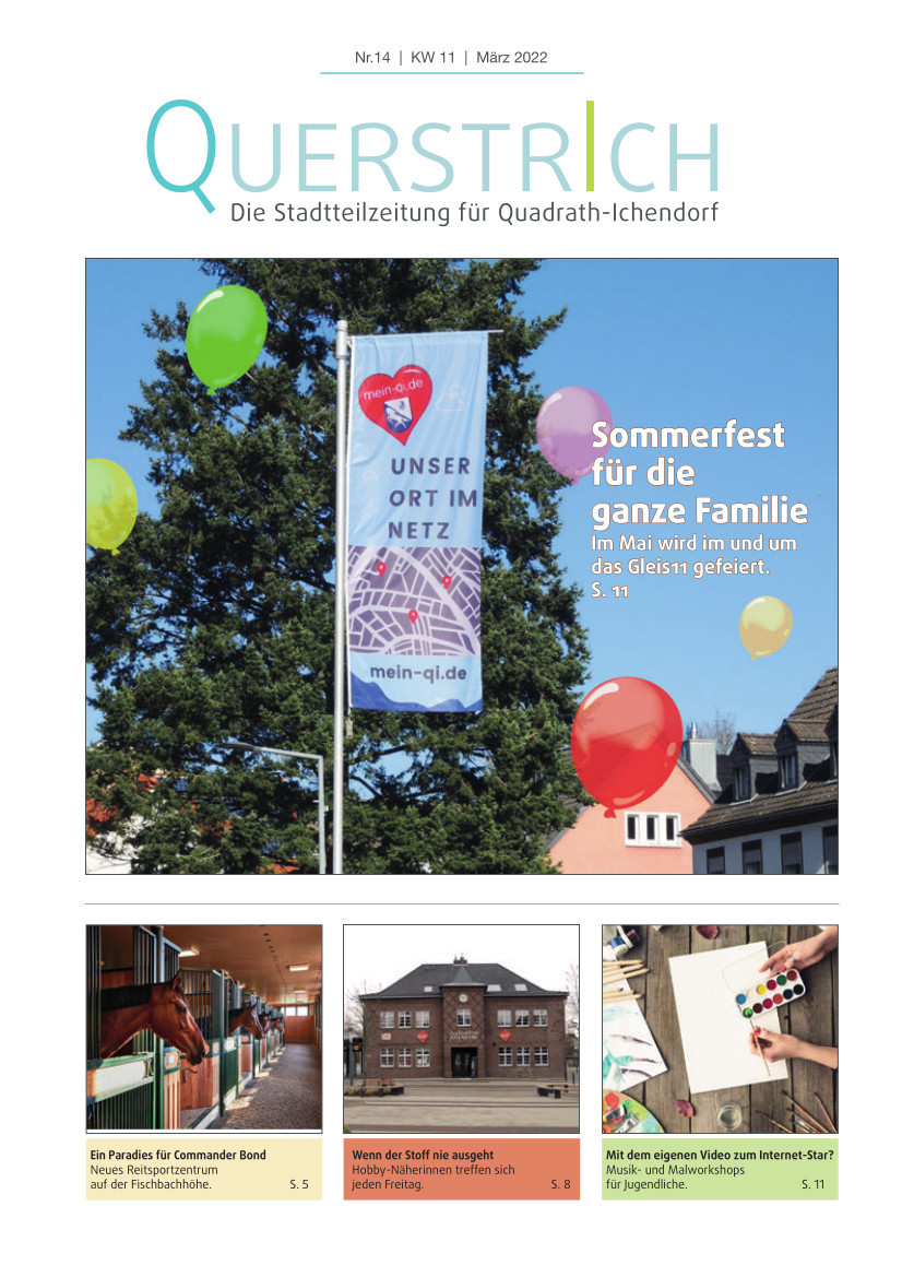 Musik, Straßentheater, Spiele, Kunstaktionen, leckeres Essen und Getränke. Das erwartet Sie am Sonntag, 22. Mai, von 15 bis 19 Uhr im Gleis11. Dann wird dort nämlich ein großes Fest gefeiert, zu dem die EGBM herzlich einlädt. Wenn Sie mehr darüber erfahren möchten, dann werfen Sie einen Blick in den neuen Querstrich, der soeben erschienen ist. Für die neue Ausgabe unserer Stadtteilzeitung haben wir uns auch im neuen Reitsportzentrum auf der Fischbachhöhe umgesehen. Außerdem erfahren Sie mehr über die Arbeit einer Doula, die jetzt auch hier in Quadrath-Ichendorf Schwangere begleitet. Sollten Sie keine Ausgabe erhalten haben oder weitere Exemplare benötigen, melden Sie sich bei uns. Auch im Rewe-Markt liegt der Querstrich aus. Über Ihre Ideen für die nächste Ausgabe freuen wir uns. Schreiben Sie uns einfach eine Mail an