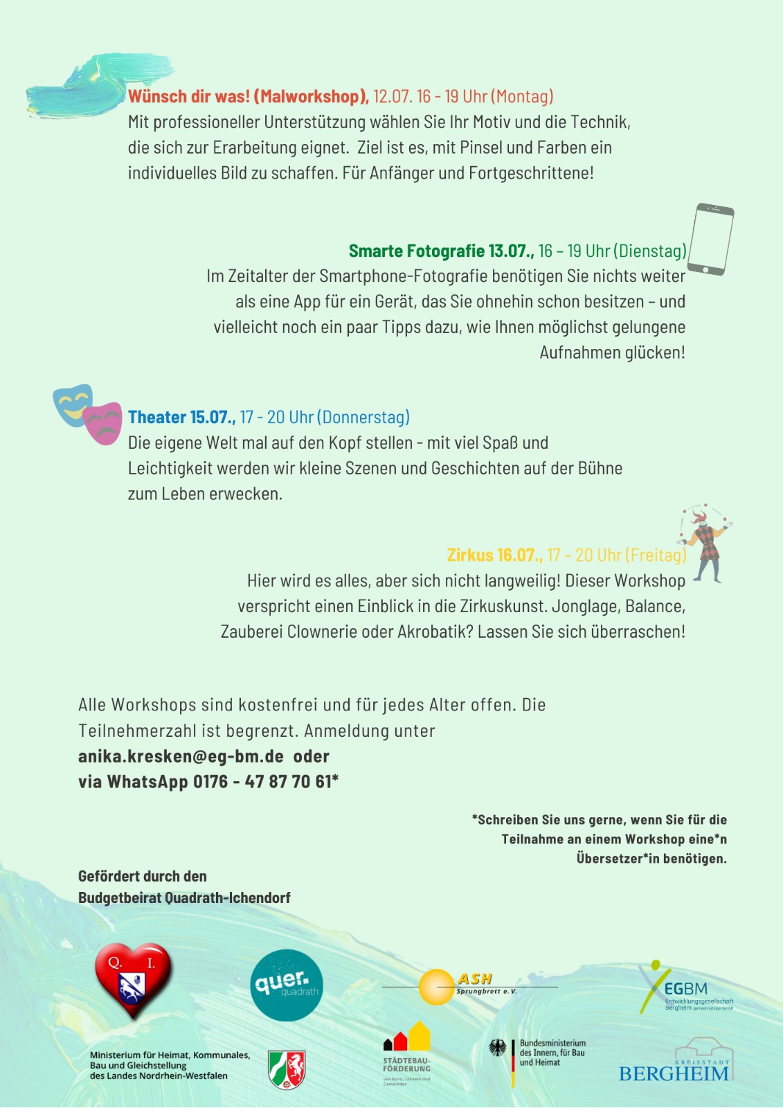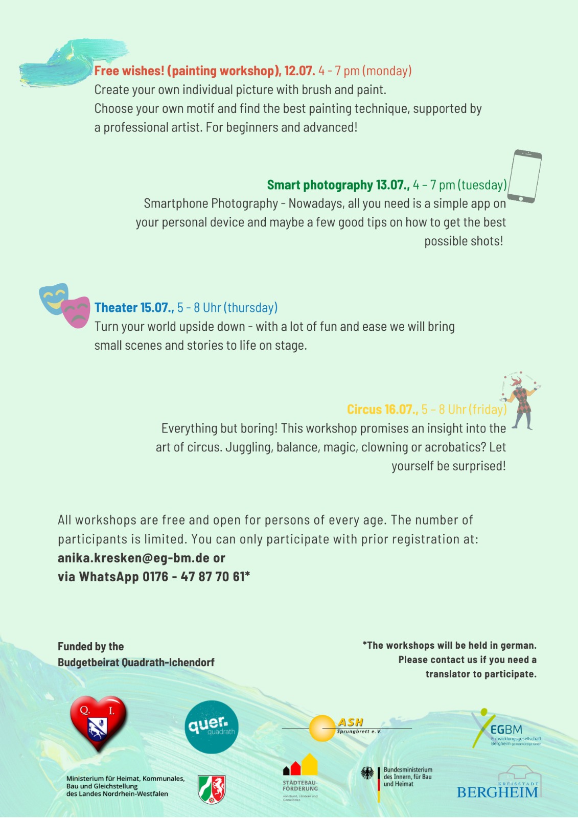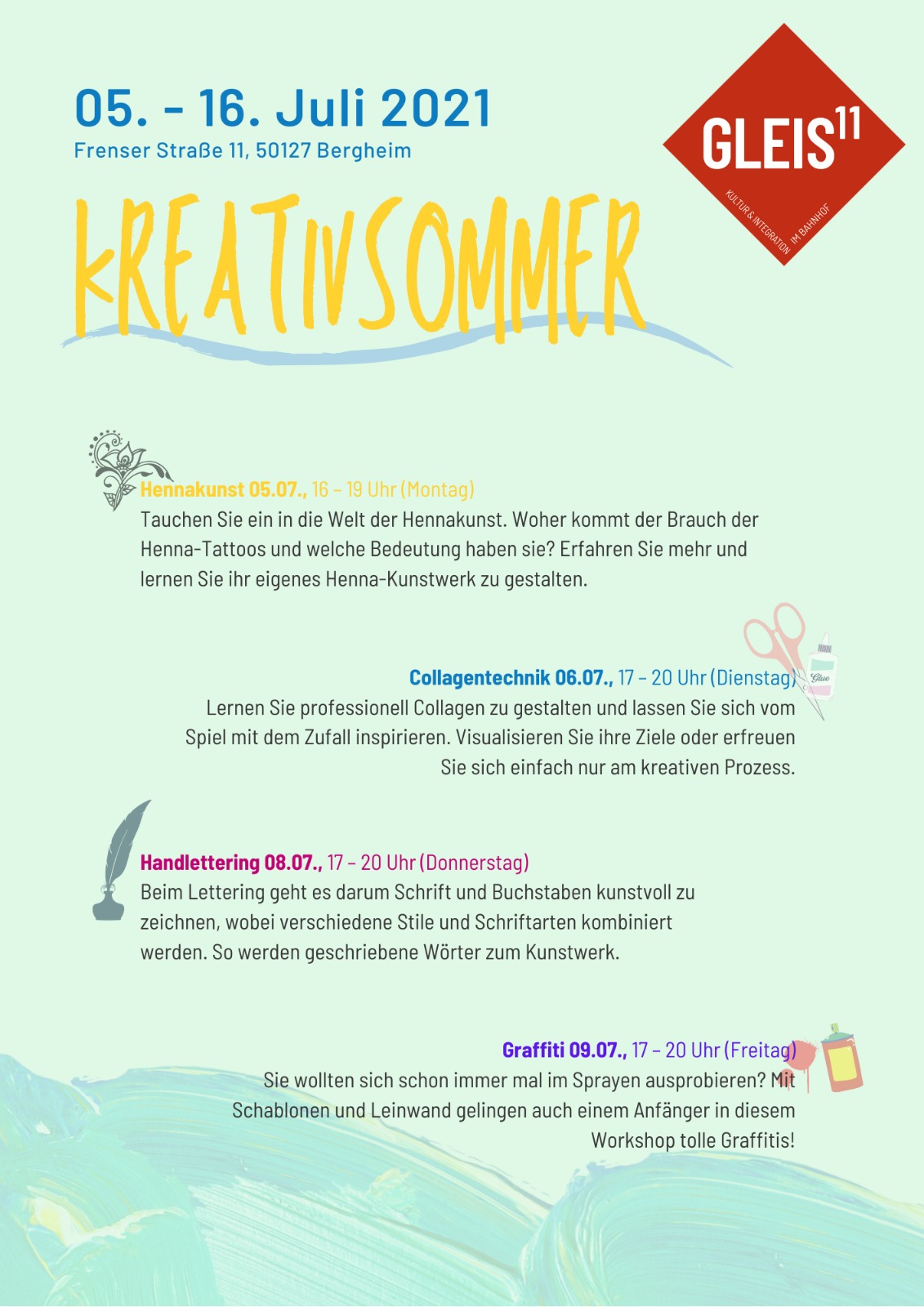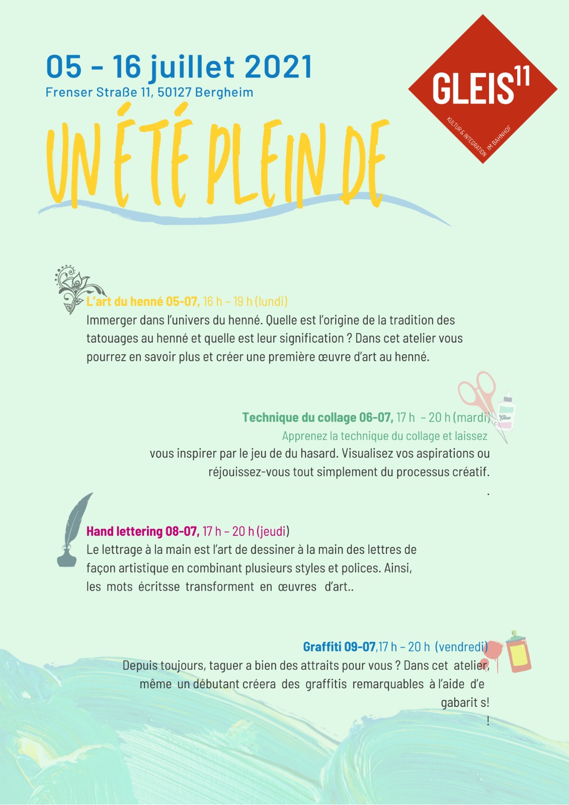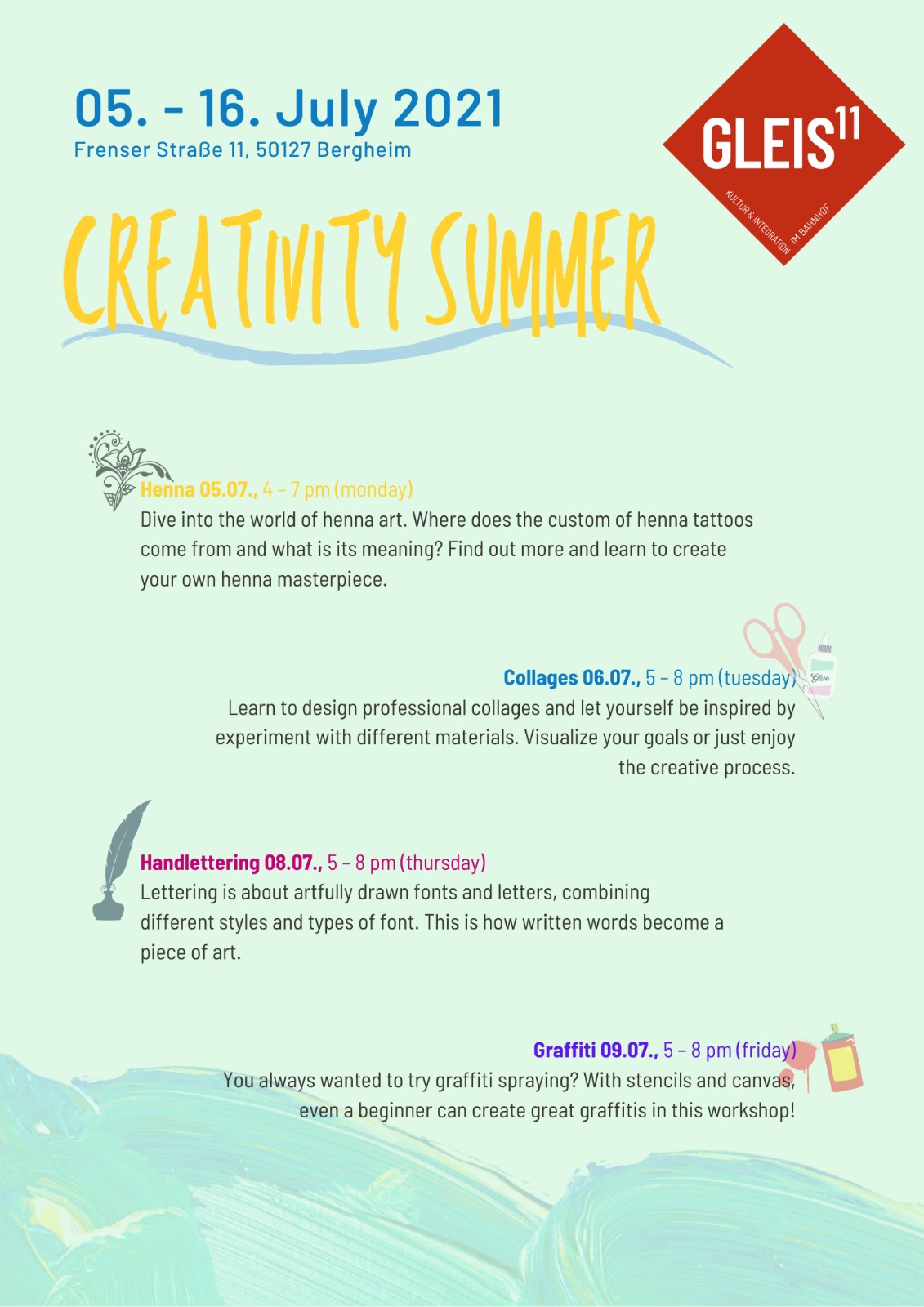 Freuen Sie sich auf die Kunst von Henna, die Gestaltung eigener Collagen, die Vielfalt des Handletterings, die Freiheit von Graffiti, einem Mal- und Smartphonefotografieworkshop sowie Einblicke ins Theater und die Zirkuskunst!