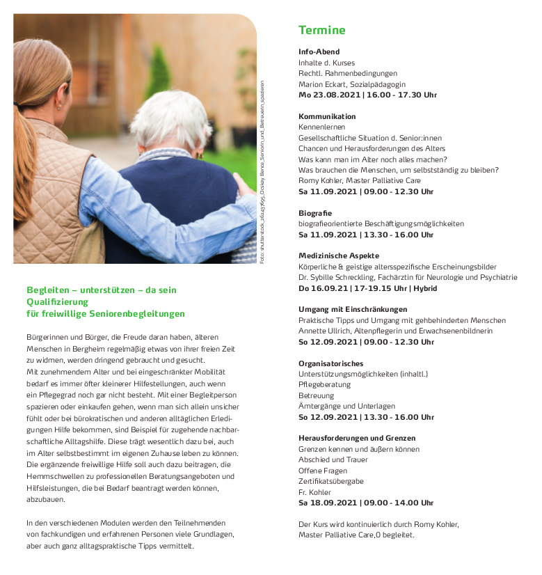 Die Teilnehmerzahl ist begrenzt. Die Teilnahme ist für Menschen, die sich regelmäßig in Bergheim für alte Menschen einsetzen möchten, gebührenfrei möglich. Eine Anmeldung ist erforderlich.