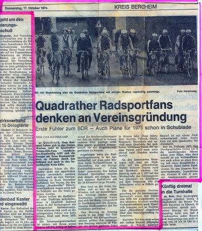 Im Herbst 1974 gründete eine Gruppe Quadrather Radsportenthusiasten einen Radsportverein, um gemeinsam ihrem Hobby nachzugehen. Bereits nach dem ersten Weltkrieg gab es in Quadrath einen Radsportverein mit dem Namen „Staubwolke“, so war man sich schnell einig, den neu gegründeten Verein auch wieder Staubwolke zu nennen. So wurde am 13.12.1974 der Verein „R.C. Staubwolke Quadrath 74 e.V.“ ins Register eingetragen. Als erster Vorsitzender wurde Uwe Welter gewählt. Bis heute folgten ihm Christian Bäcker, Herrmann Keller, Franz Neukirchen, Toni Kirsch, Klaus Lang, Günter Sporn und Daniel Knyss.